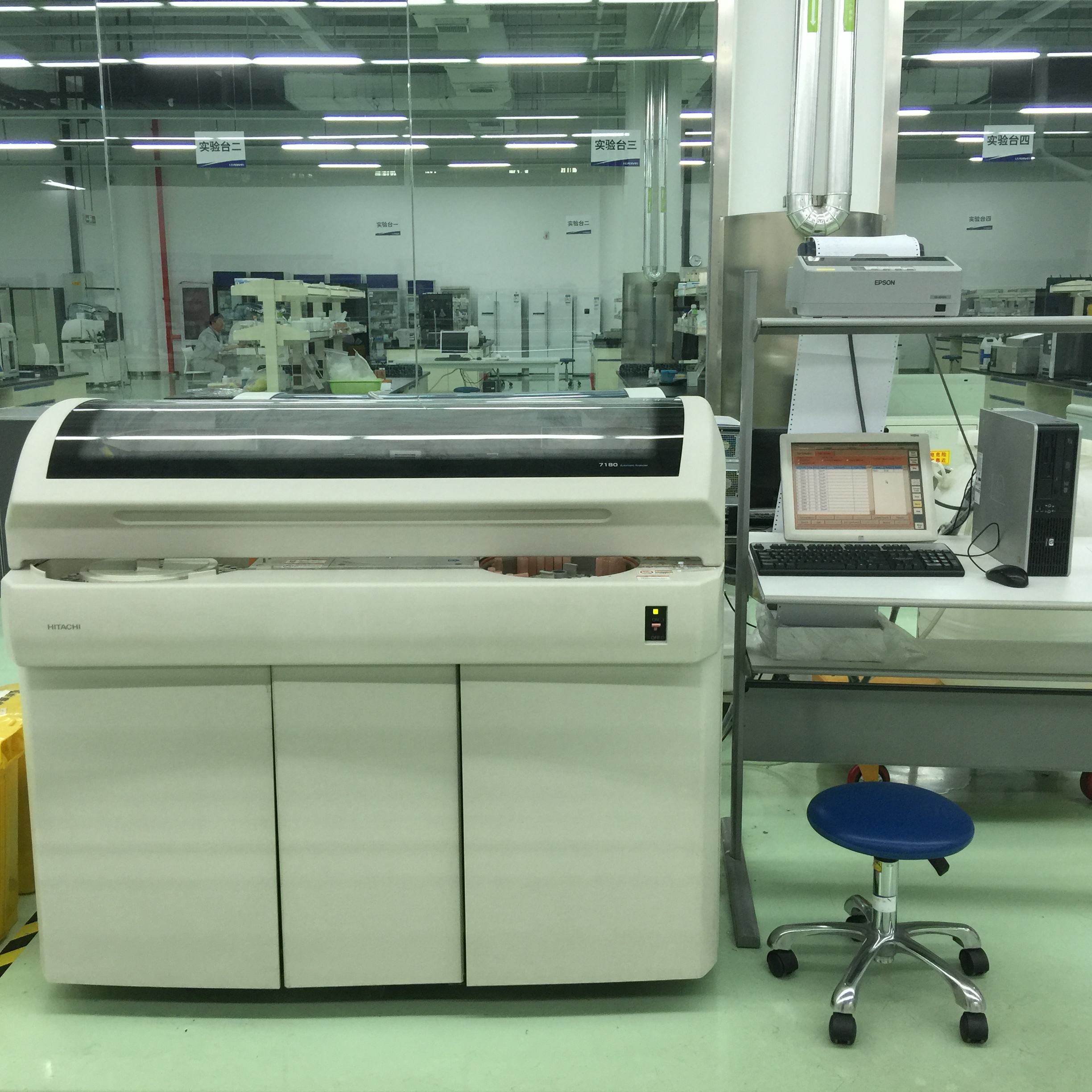 日立7180全自动生化分析仪:7180是一款源自日本的原装进口仪器,采用独立的单反应杯系统,可用与终点法、比浊法、速率法、两点分析各类生化项目,标本处理能力达800次/h,可同时进行45类项目测试,85种参数设定。340~800nm12个波长。单波长或双波长测光点34个,反应时间十分钟,大大提高了反应效率。常规样品和急查样品数量高达10000,在时间和数量上有着极大的检测优势。此外,该仪器实现了超微量分析,有完善的预报警系统和电脑监控功能,确保了实验的顺利进行和不必要的时间浪费。