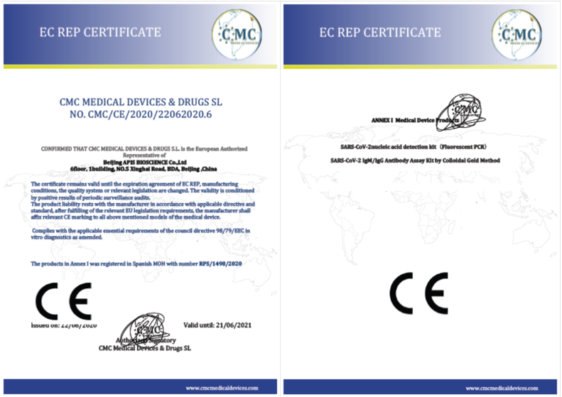 伴随着国内外新型冠状病毒疫情的持续发展,新冠病毒检测是疫情防控的重要手段。北京阿匹斯生物科技有限公司(简称“阿匹斯科技”)的两项新型冠状病毒检测产品于近日完成了欧盟CE认证,这两项产品分别为新型冠状病毒(SARS-CoV-2)核酸检测试剂盒(PCR-荧光探针法)(英文名称:SARS-CoV-2nucleic acid detection kit (Fluorescent PCR)和新型冠状病毒IgM/IgG抗体检测试剂盒(胶体金法)(英文名称:SARS-CoV-2 IgM/IgG Antibody Assay Kit by Colloidal Gold Method)。
