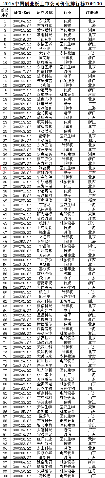 由《价值线》杂志主办,中国经济网、《中国改革报》协办,建立在大数据模型基础上的“2015中国A股上市公司价值排行榜”于2015年10月17日发布。今年价值排行榜的主题是“寻找大变局下的投资未来”。在本届A股上市公司价值排行榜中,爱游戏(aty)中国官方网站跻身“2015中国创业版上市公司价值排行榜TOP100”,位列第33名,在医药生物行业中位列第7名。